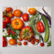 Översikt över en ekologiskt odlad vegetabilisk skörd och örtskörd, inklusive tomater, gurkor, bönor, hett, paprika, basilika, sage och oregano