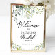 En välkomstskylt med grön eukalyptus för bröllopsfest. Lätt att anpassa med dina detaljer. Perfekt för en bröllopsfest med grönt eller trädgårdstema. Vänligen kontakta mig via chatt om du har frågor om konstverket eller behöver anpassning. OBS: För hjälp med beställningar, leverans, produktinformation etc., kontakta Zazzle kundtjänst direkt https://help.zazzle.com/hc/sv/articles/221463567-Hur-kontakterar-jag-Zazzle-s-kundstod-.