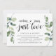 Modern Rustik Grönska Eukalyptus, Svart Skript temafäst inbjudningskort (med kort titel: Inget fancy, bara kärlek). Det är perfekt för din bröllopsfest / efterbröllopsfirande. Lägg till dina detaljer i matchande svart teckensnitt / bokstäver.