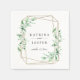 Elegant gyllene geometrisk ram dekorerad med akvarellgrönska, personliga pappersservetter. Designfunktioner, malltextrader för namn och datum.