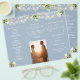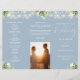 Denna eleganta bröllopstri-fold program har blomstergrönska och strängljus på en dammig blå bakgrund. Designad av Thisisnotme©