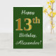 Denna enkla födelsedagkortdesign presenterar meddelandet "den 13th födelsedagen för lycklig", med "13th" ha en utseendemässig fauxguld-något liknande. Den presenterar också ett personlignamn och en mörk - grön bakgrund. Den kunde vara fallen för någon som firar deras trettonde födelsedag.