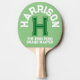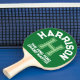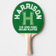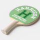Personlig pingpongpaddel med ditt namn och din familj namn initialt och team eller slogan i vitt, grönt och mörk grönt, den ena sidan har bakgrund i mörk grönt den andra i mitten av grönten. Läser Harrison H Pingpongmästare. Anpassa den djärva sportpaddeln stil med ditt eget namn och starta och lagera namn eller lägg till en slogan. Designad av www.mylittleeden.com på zazzle.