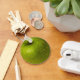 Stängningsvy för ett enda äpple av grönt. Äpplet är blöt och är tungt täckt med droppar av rent vatten. Lustigt nyckelkedja.