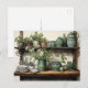 Söt vintage, land kökshylla med grönt och vita keramiska diskar, kök, kaffekanna, krämer, sockerskål samt lera blomkrukor och kål på en skorstenshylla av trä. Vita Geraniumer, gröna, klöver och vita blommigtar.