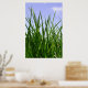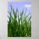 Den fotografiska bilden är en öga-kryp-vy av grönt gräs med blå himmel i bakgrunden.