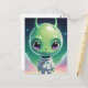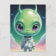 En slimmad grönt med ett komiskt överdimensionerat huvud och krångliga horn gör ett elegant, högteknologiskt kostym som glimrar med futuristiska mönster. Dess uttryckliga ögon tittar ut från baksidan av en tydlig visare och antyder en olycklig nyfikenhet på kosmos.