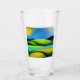 Det digitala vattenfärgslandskapet är utformat i vibrerande nyanser av blått, grönt och gult med sol och fåglar.
