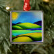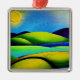 Det digitala vattenfärgslandskapet är utformat i vibrerande nyanser av blått, grönt och gult med sol och fåglar.