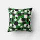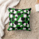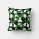Dekorativ kudde har en Bauhaus-design av trianglar, cirklar, rektanglar och pentagoner i svartvitt på en fält av grönten.