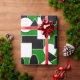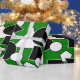 Denna papper har en Bauhaus-design av trianglar, cirklar, rektanglar och pentagoner i svartvitt på en fält av grönten.