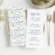 Förenkla din bröllop-upplevelse med de här menykorten för elegant, vattenfärg, rustik bröllop, som är adsorberade med vibrerande blått och gult blommor och som kompletteras med sofistikerad marin blå text.