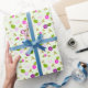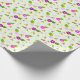 Denna papper för omslagning av söt blommigt har en bakgrund av blekens grönt och söt vår blommor, fjärilar och drakflugor flyger omkring. Perfekt för födelsedagslagring papper.