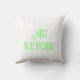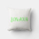 En elegant och roligt vit dekorativ kudde med Fransk hälsning för hej/ bra morgon på framsidan och adjö på baksidan i ett färdigt, dynamiskt grönt modernt typsnitt. Njut.