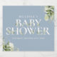 En elegant pojke baby shower design med chic typografi och vacker botanisk grönska på en dammig blå bakgrund. Utformad av Thisisnotme©