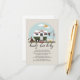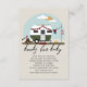 Barn som duschats i äventyr med illustration av grönt- och vintage-kamerafodral med lumberjack-barnkläder hängande på klameran som är kopplad till björk träd under blå himmel med sol och moln. I texten står "bokar för baby" Camper dekoreras med plaid bunting, stump med yxa, campfire, lantern, plaid matta och evergreen grenar.