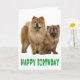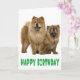 Det här födelsedagskortet för roligt hund innehåller ett par snyggt krämfärgade och bruna Chow Chow-valper som markeras mot en skarp vit bakgrund med Grattis på födelsedagen tryckt i ett fet grönt.
