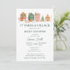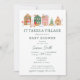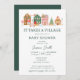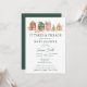Julbabyduschinbjudningar med temat "Det tar en by" och gröntens bakgrund.