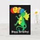 Ett färglöst födelsedagskort för en 6-åring med grönt- och gult-dragon, med ballonger i svart bakgrund, från en vattenfärgsmålning av Judy Adamson. Hälsning på framsidan är "Grattis på födelsedagen" med vit text och insidan lämnas tom för ditt eget budskap.