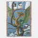 Grönt liten drake på en träd på vintern som försöker göra vänner med kycklingar.