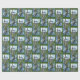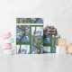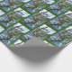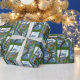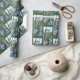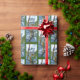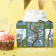 Grönt liten drake på en träd på vintern som försöker göra vänner med tre kycklingar.