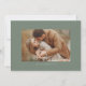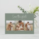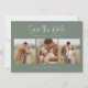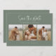 Grönt Simple Calligraphy Script Four Photo Save the Date har en trio foton på framsidan, tillsammans med modern, minimal text. Ett enda stort foto på baksidan, med din bröllop webbplats.