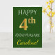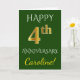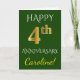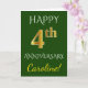 Denna enkla, personliga gratulationskortdesign för årsdag har budskapet "HAPPY 4th ANNIVERSARY", där "4th" har ett falskt guldliknande utseende. Framsidan har också ett anpassat namn och en grön bakgrund. Insidan har ett anpassningsbart gratulationsmeddelande för årsdagen. Det kan ges till en make eller hustru för att fira parets fjärde årsdag. [~Z0000086]