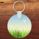 Vit duva som flyger över blå himmel ovanför grönt fält