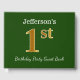 Gästsymbolen bok har ordnumret "1st" med ett faux guld-liknande utseende. Den har också en personlig namn och en grönt färgad bakgrund. Den kan användas i party för att fira sin första födelsedag. [~Z0000056]
