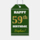 Den här märkrn med födelsedagspresent innehåller ett meddelande som "LYCKLIG 59:e BIRTHDAY, Stephen!", där namn kan vara personlig och där siffran "59:e" har ett utseende som liknar guld/imitation färg. På framsidan finns också en färgad för grönt. Baksidan har en Från:-linje. Märkre av födelsedagspresent som dessa skulle kanske kunna användas på gåvor som ges till någons femtionionde födelsedag. [~Z0000210]
