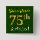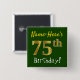 Den här enkla fyrkantiga knappdesignen innehåller ett meddelande som "Namn-här’s 75:e Birthday!", där "75:e" har ett utseende som påminner om guld, som liknar faux/imitation, på gröntens färgad. Namn kan vara personlig. Knappar som dessa skulle kanske kunna bäras av gäster i en födelsedagsfest till någon som firar sin sjuttiofemårsdag, där party hålls i ett stort område med många andra närvarande personer (t.ex. en stadspark eller en temapark). [~Z0000163]