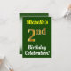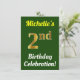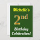 Födelsedagsfest inbjudan har ett budskap som "Michelles andra födelsedag Firande!", där namn kan vara personlig och där nummer "2:a" har ett faux guld-liknande utseende. Den har också en bakgrund för färgad av grönt. Händelseinformationen på baksidan kan vara personlig. Den skulle kunna användas till inbjudan för att fira eller födelsedagsfest på någons andra födelsedag. [~Z0000121]