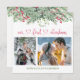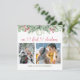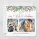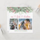 Vårt första julfoto-kort. Utformningen har en vattenfärgad illustration av grönt löv och röda bär. Texten "Vår första julklapp" är skriven i kalligrafiskt stil. Ställe dina foton nedan för att slutföra.