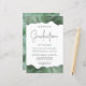 Den här inbjudan till studentfest i trendig har en överkant och grund gräns med vattenfärgat agate-geod i skuggor av grönt med högdagrar från Faux silver glitter. Ord "Studenten" visas i faux silver glitter i dekorativt modernt handskriftsteckensnitt. Anpassa inbjudan med namn i student i sidans grönt och party i grått med kol på vit bakgrund. En matchande bild av sidans grönt och silver agate visas på baksidan.