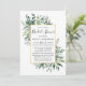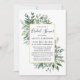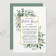 Modern Elegant Delikat Watercolor Botanical Grey Inbjudningskort för möhippan Card omfattar lövning i grönt, dammiga blå löv och andra vackra botaniska grejer. Guld Ram. Skicka tillbaka Grönten.