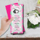 Och hon är på altaret! Ett dam i hennes Derby-hat mot bakgrund av shock rosa, grönt och vitt diagonalt rand är en roligt till gästerna i inbjudan till den skam som ska bli den Derby-themed möhippa party. MATCHING-objekt i vår samling.