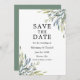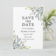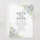 Modern Elegant Delikat Watercolor botanical Grey Bröllop Förlovning Announcement Save Datumkortet omfattar grönt bladage, dammiga blå löv och andra vackra botaniska grejer. Skicka tillbaka Grönten.