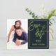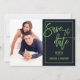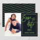 Bröllop spara datum-fotokort med kursivt handskriftsskript och trendig färg-schema-anpassade till dina händelsespecifikationer. Exempelbilden har använts med behörighet.