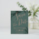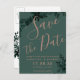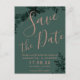 Skriptet grönt guld i Ro grönenery sparar datumet för inbjudan till bröllop. Skicka ditt datumkort med den här eleganten faux ro guld typografi med vattenfärgen grönt löv blad på grått bakgrund, perfekt för chic stil bröllop