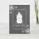 Ett babyduschkort med ett bildkort med en illustration av en polar i baby som bär en grönt hatt och scarf över en schalkboard-inspirerad bakgrund med snöflingor överst till lämnat och grund höger. Matchande inbjudningar till babydusch vid koordinering finns på Jill's Paperie.