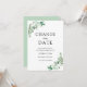 På grund av senaste händelser eller oförutsedda omständigheter kan du behöva skjuta upp ditt bröllop. Skicka dessa kort till dina gäster för att låta dem veta om datumändringen. Funktioner orden "ändra datum" i kalligrafi, omgiven av en ram av grönska och vita blommor.