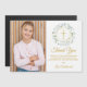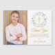 En dekorativ lagerkrans, guldringar och krucifix sitter ovanför ditt speciella första heliga kommunion tack meddelande och bredvid ditt eget foto på denna eleganta design. Baksidan har en matchande lagerkrans, guldringar och krucifix. Designad av Thisisnotme©
