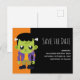 Spara datumet Halloween-födelsedagsinbjudan med ett roligt Halloween-bild med en grönt Frankenstein-monster.