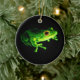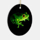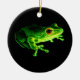 En fraaktaliserad grönt groda med orange öga mot svart bakgrund.