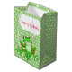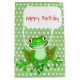 Cute grönt grog på mjuk grönt och vit polka-punktbakgrund med tal bubbla under vilken ålder som helst. Text kan redigeras.