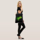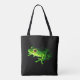 En fraaktaliserad grönt groda med orange öga mot svart bakgrund.