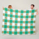Bedårande, fantasifull grön och vit gingham-mönstrad filt med söta gula solrosor med glada ansikten i varje av de ljusgröna rutorna.