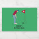 Ljusgolfer, med en hatt, röd skjorta och blå byxor, som sätter en golf boll i en flaska-etikett av hål. Anpassa texten.