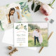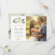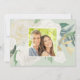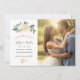 Bröllop sparar datum-kort med två förlovningsbilder med en "Spara Vårt Datum" blomsterakvarell med blommor och grönska design på framsidan och baksidan. Färgerna inkluderar en mjuk grön bakgrund (kan anpassas) med neutral vårvit, kräm, rosafärgad, guld och grön.