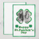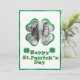 Detta anpassade St. Patrick's Day-kort har en lyckosam klöver fotoram. Ramen har en guldglitter och grön foliedesign. Ett exempel på ett foto är placerat inuti som du kan anpassa för att inkludera ditt eget foto eller annan bild. Grattis St. Patrick's Day-hälsningen är tryckt i en matchande grön folie och guld glitter bubblig teckensnitt. Två klöver placeras på vardera sidan.